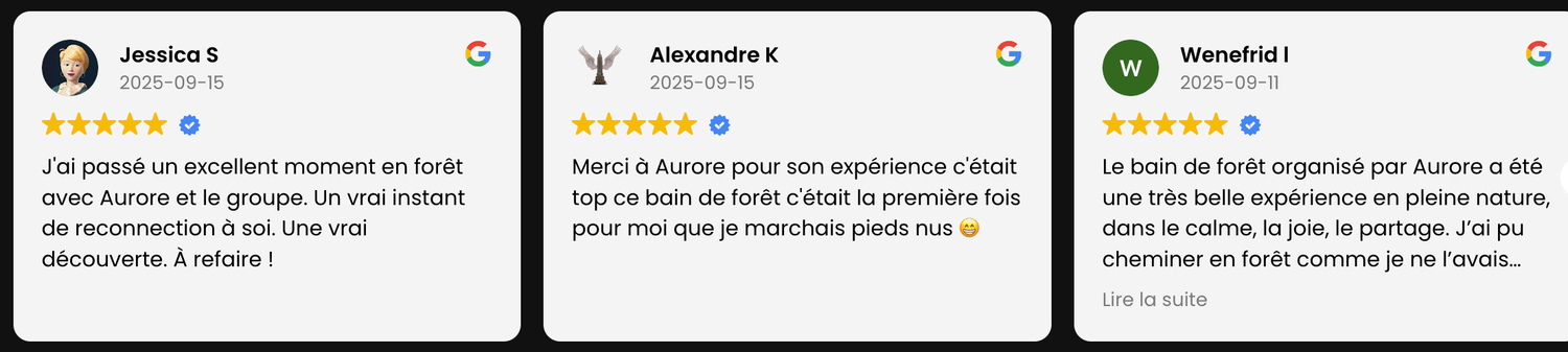 “Aurore est une guide exceptionnelle. Elle a l’esprit ouvert et elle vous transmet un sentiment de calme lorsque vous marchez dans la forêt. Il est parfois difficile de se déconnecter de nos mauvaises habitudes et de redescendre sur terre. Elle est consciente de cette difficulté, et tous les exercices sont proposés avec patience et bienveillance. Vous ne regretterez pas cette expérience, qui vous rendra reconnaissant pour les choses simples, naturelles et humaines.”