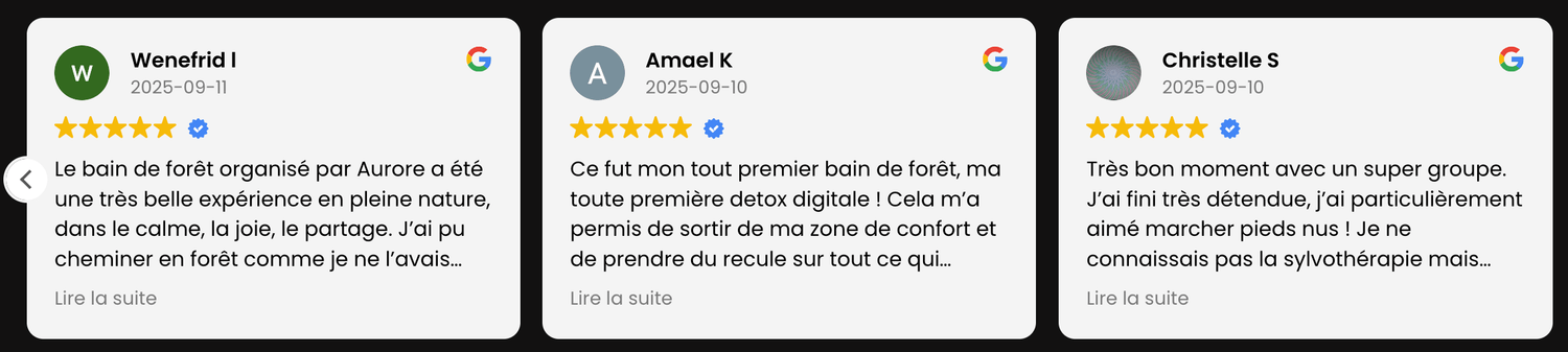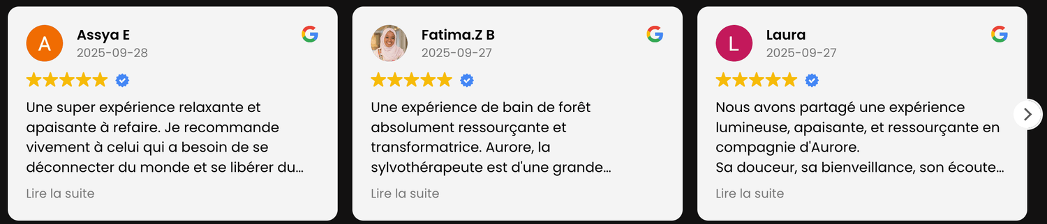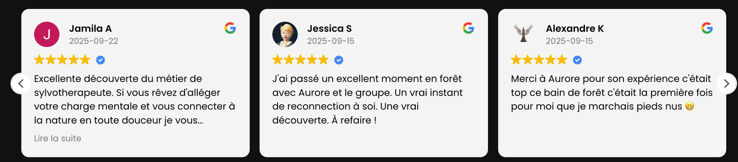 "Moi qui ne sait pas ralentir, je suis étonnée de voir que j’ai pu me calmer pendant le bain de forêt, prendre du plaisir, et me régénérer. Après la séance j’avais une énergie incroyable. Franchement, merci !"